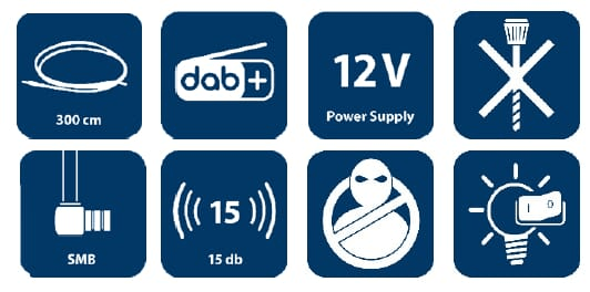 Longueur : 3 m Nombre de bandes de fréquence : 2 Bande de fréquence 1 : 0.150-6.200 MHz Bande de fréquence 2 : 76.0-108.0 MHz Facteur de bruit : 6 dB(A) Profit : 15 dB(A) D-net : n/a E-net : n/a UMTS : n/a GPS (système de positionnement mondial) : n/a DVB-T (diffusion vidéo numérique terrestre) : n/a DAB (diffusion audio numérique) : Oui FM : Oui Plage spéciale poiur radio : Oui Avec amplificateur : Oui UHF : n/a VHF : n/a Type d'alimentation : 12 V de batterie En intérieur : Oui En extérieur : Non Raccord : SMB F Type de connexion : Coller Avec câble de connexion : Oui Longueur du câble de connexion : 2,85 m MIMO (entrée multiple sortie multiple) : n/a