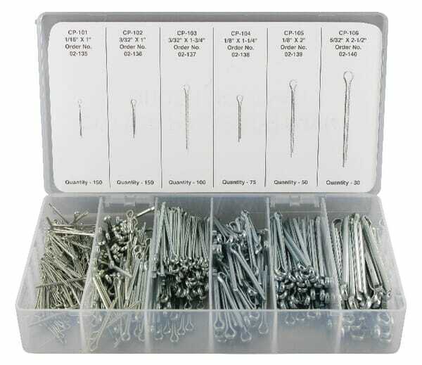 Se compose de : - Ensemble assorti de 555 goupilles fendues - 150 x 1/16'' x 1'' - 150 x 3/32'' x 1'' - 100 x 3/32'' x 1-3/4'' - 75 x 1/8'' x 1-1/4'' - 50 x 1/8'' x 2'' - 30 x 5/32'' x 2-1/2''