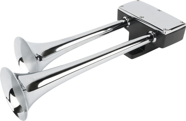 Extra info : - Klaxon, 1x support, raccord coudé M12 avec filetage M12x1,5 et PTC (Push To Connect) pour tuyau d'air 6 mm - Nécessite : Pression d'air 4 bar - 8 bar (60 - 120 psi) - Alimenté : par compresseur d'air (exclu) - Cornes recouvertes de poudre noire. Cette finition est plus vulnérable qu'une finition chromée. Une chute ou un coup peut endommager la couche de peinture.