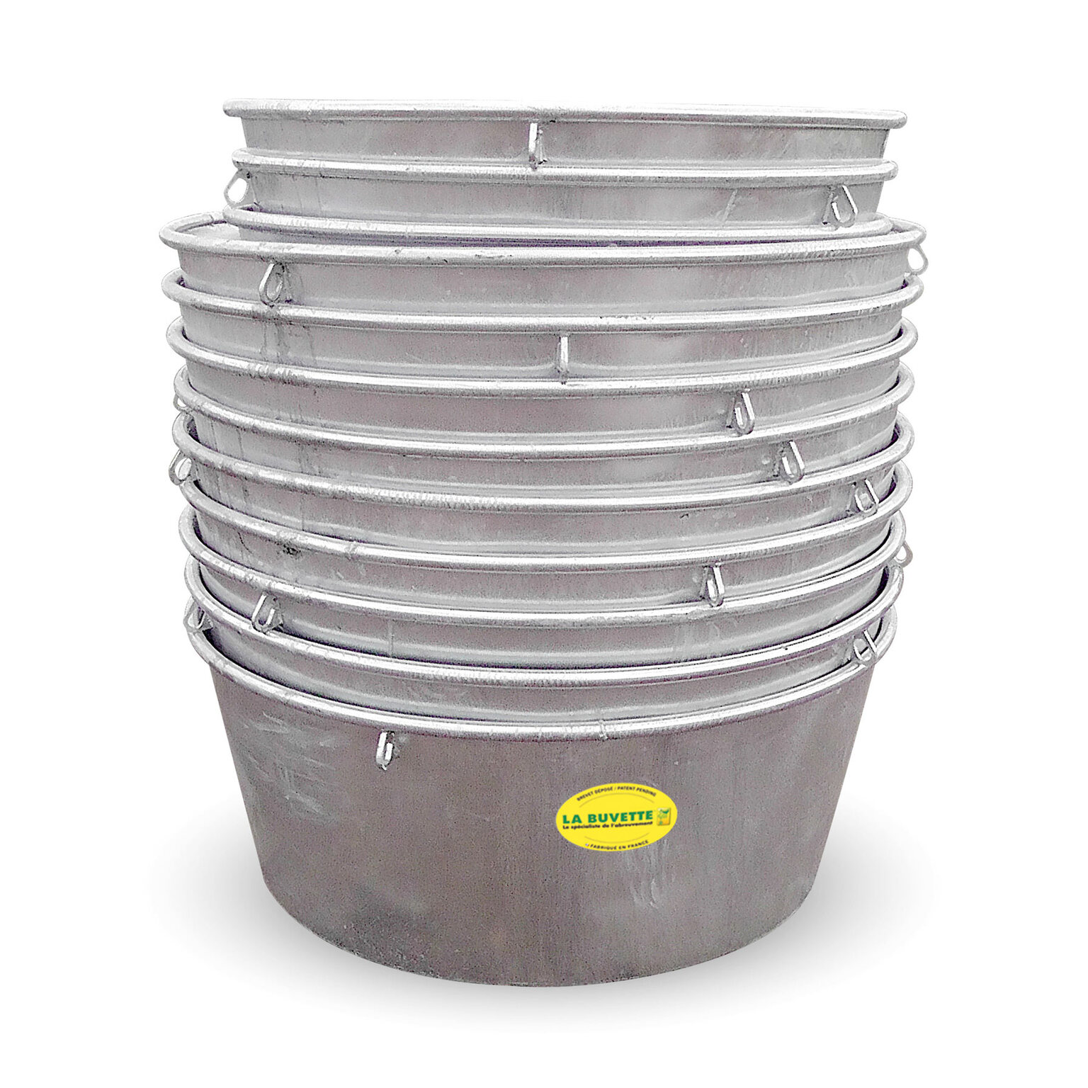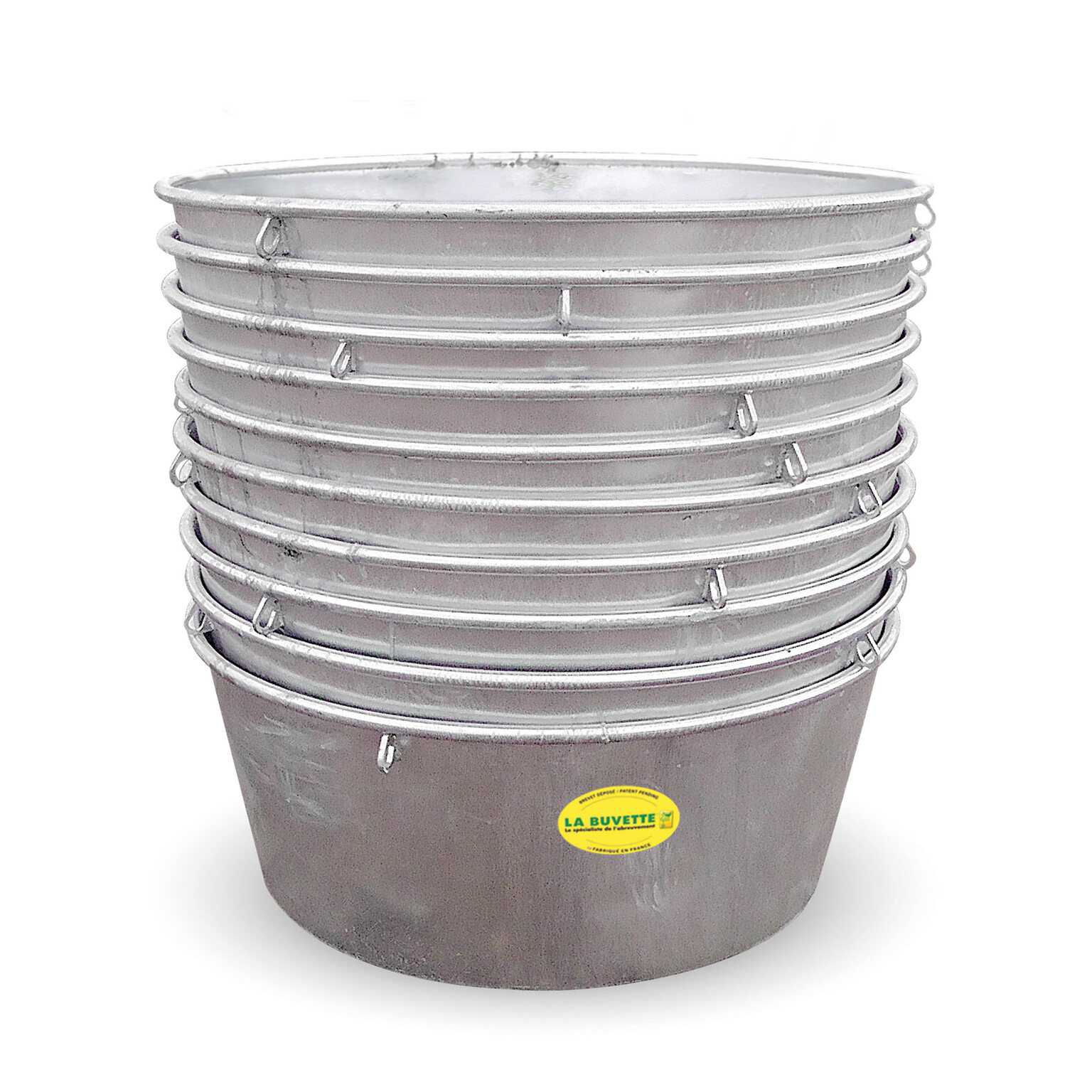 > Forme conique : les bacs s’empilent facilement pour le transport. Cette forme diminue le risque de coups de pieds par les animaux.