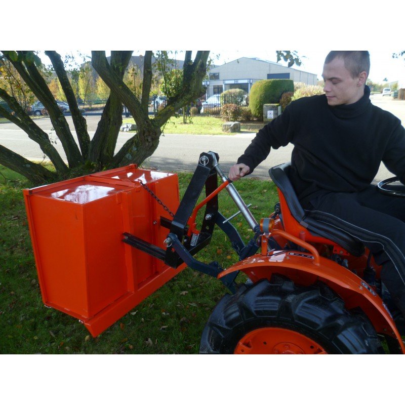 A atteler derrière votre tracteur 3 points, cette bennette à basculement central possède une lame rabot et une porte arrière amovible.