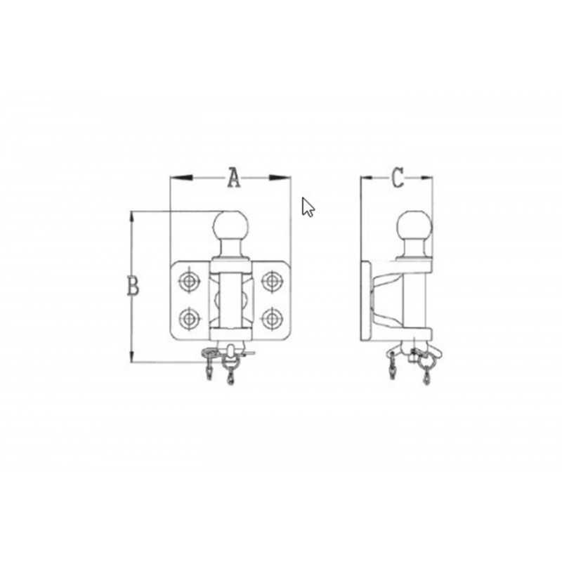 Il est conçu pour s'installer sur les attelages avec crochet sur platine et peut être installé sur tout type de véhicule 4 roues comme par exemple une voiture, une camionnette, un van, etc... Chape de remorque 4 trous diamètre 17 entraxe 90 x 40 axe 24 mm En acier forgé - charge d'appui 150 kg - Semelle 125 x 90 Poids : 3,050 kg. A: 125 mm B: 200 mm C: 95 mm