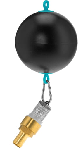 Détails du produit : Pour récupérateur/citerne d'eau de pluie et similaires, boule PE noire (Ø 145 mm) avec deux oeillets de retenue, clapet de pied en laiton avec panier inox dévissable