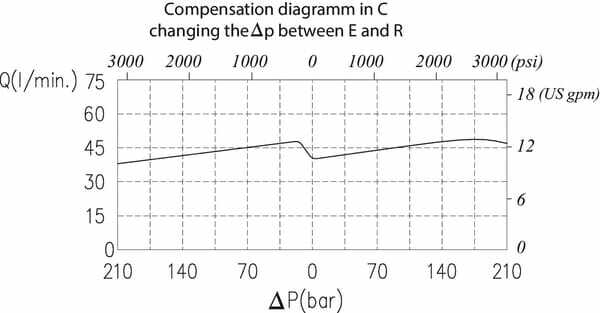Débit : This adjustable 3-way pressure-compensated flow control valve (parallel valve) allows flow from E to C and / or R. The inflowing oil into port E is delivered to C first, independent of the load (p = 7 bar). The excess flow can be used for a separate circuit.