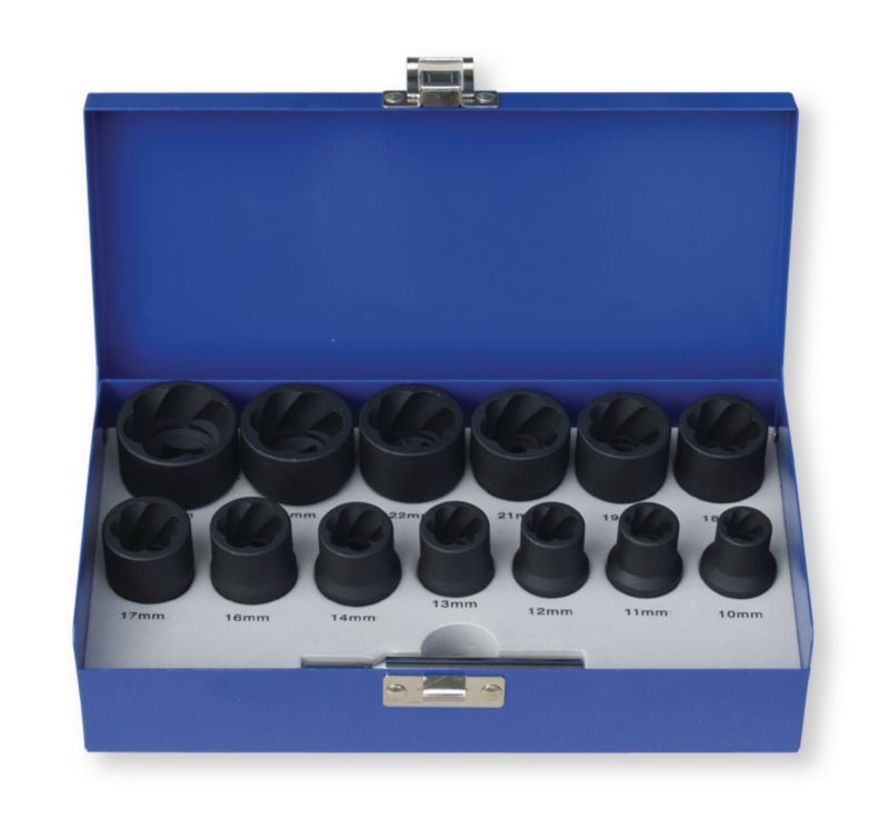 Coffret 13 douilles spiralées 1/2' impacts pour écrous abimés Ø 10 - 11 - 12 - 13 - 14 - 16 - 17- -18 - 19 - 21 - 22 -24 - 27 et un chasse pour la dépose des écrous abimés. (par 1)