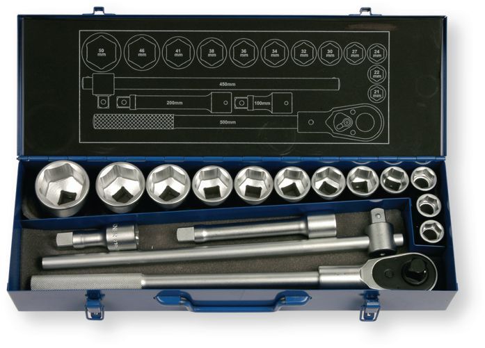 Produit réservé aux professionnels Coffret douilles Berner 3/4' 12 douilles 6 pans (diamètre 21- 22 - 24 - 27 - 30 - 32 - 34 - 36 - 38 - 41 - 46 - 50) 2 rallonges (100mm et 250mm) (par 1)