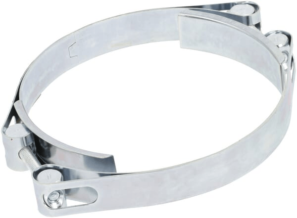 Collier de serrage très robuste en 2 parties avec double bande pour une force de serrage très élevée, entièrement en acier zingué. La plage de serrage est indiquée sur la bande de serrage au moyen d'un texte imprimé.