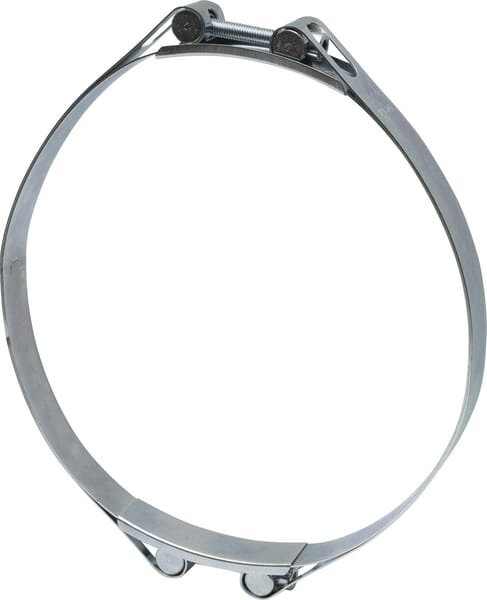Collier de serrage très robuste en 2 parties avec double bande pour une force de serrage très élevée, entièrement en acier zingué. La plage de serrage est indiquée sur la bande de serrage au moyen d'un texte imprimé.