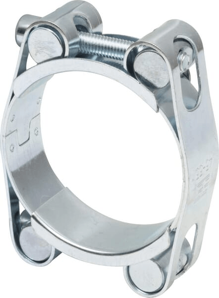 Collier de serrage très robuste en 2 parties avec double bande pour une force de serrage très élevée, entièrement en acier zingué. La plage de serrage est indiquée sur la bande de serrage au moyen d'un texte imprimé.