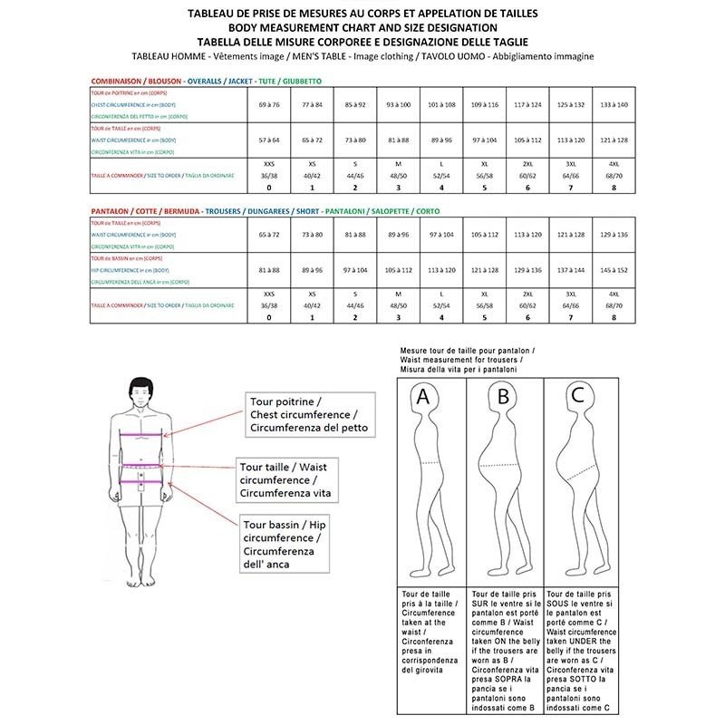 Combinaison homme avec col officier. Intérieur de col en opposition. Poche poitrine avec rabat dans emmanchure. Rabat en opposition, fermé par un bouton pression. Poche poitrine intérieur sur côté gauche. Elastiques dos. Poches italiennes. Passe-mains sur côtés avec bouton pression. Poches cuisses avec soufflets en opposition, et fermées par rabats pressionnés. Rabats en opposition.