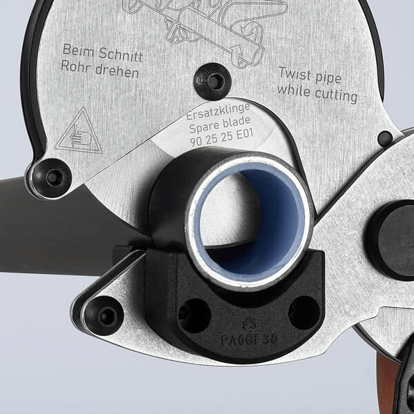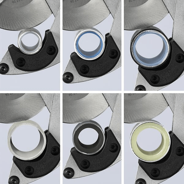 Coupe-tube KNIPEX pour tubes composites et plastiques avec des résultats de coupe optimaux, le mouvement de rotation permet à la molette de coupe de pénétrer sans effort avec une déformation minimale du tube.