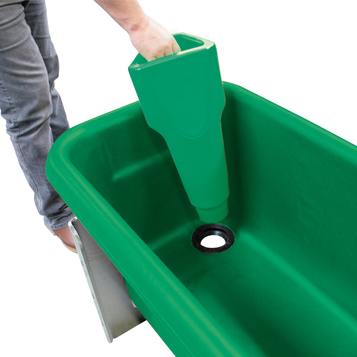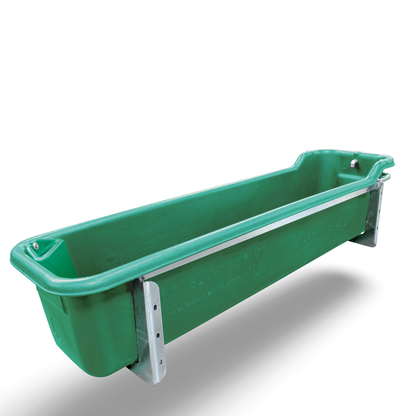 Grand bac en polyéthylène pour récupérer l'eau tiède en sortie de pré-refroidisseur de lait et la distribuer aux vaches, immédiatement après la traite.