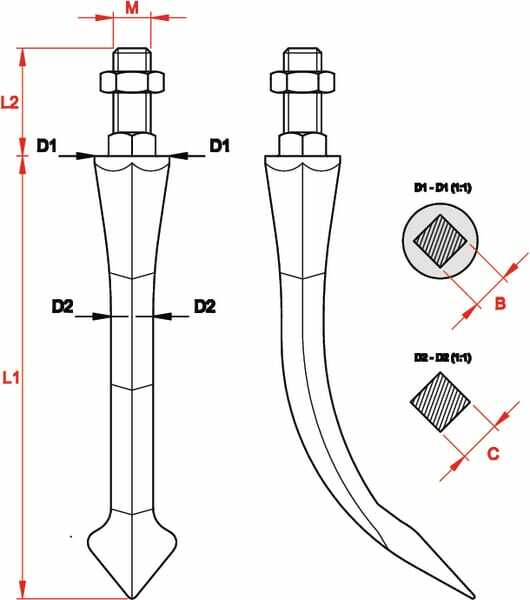 Pièces d'usure d'herses, Dents de herse: à cuillère, traîté - courbé