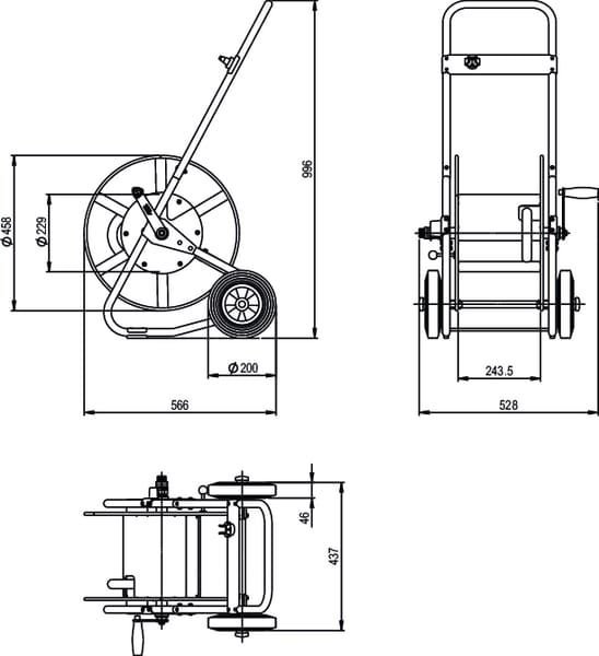 Particularités : - Tube courbé guide le tuyau parfaitement sur la bobine - Poignée extra longue - Roues larges, caoutchouc avec un grand diamètre