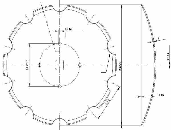 Disques pour herses à disques, charrues et semoirs Catégorie de produits : Disque de coutre Diamètre extérieur : 660 mm Épaisseur : 6 mm Type : Concave dentée Centre plat : Non Forme de l’orifice central de montage : Carré Largeur de l’orifice central de montage : 41,5 mm Nombre de trous de montage : 4 Diamètre de perçage de trous de montage : 218 mm Nombre d’encoches : 10 Concavité : 115 mm Convient pour la marque de machine/véhicule : Universal