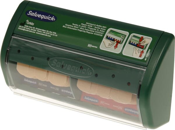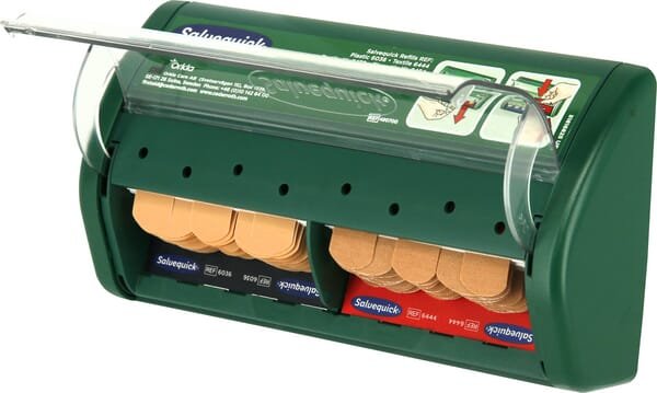 Le distributeur pratique de pansements Salvequick contient deux types de pansements différents qui se retirent facilement du distributeur en les tirant vers le bas. Cela évite tout contact et tout saignement sur les autres sparadraps présents dans le distributeur, ce qui garantit un niveau d'hygiène élevé.