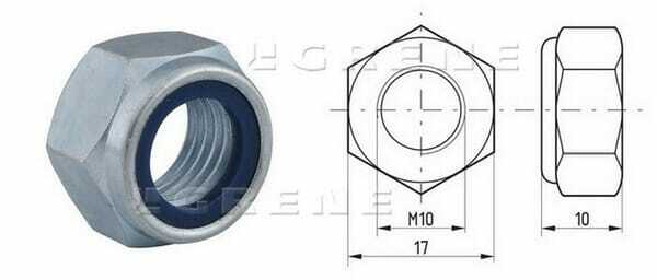 Écrou frein hexagonal (contre-écrou), type haut, avec une bague en nylon pour empêcher le desserrage dû aux vibrations, etc. La norme ISO 10511 remplace la norme DIN 985 , les tailles de clés 16, 18 et 21 correspondent aux tailles respectives M10, M12 et M14.
