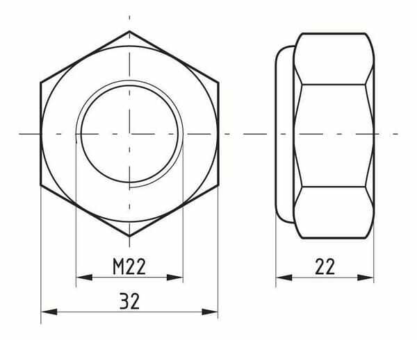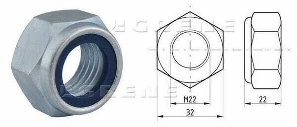 Écrou frein hexagonal (contre-écrou), type haut, avec une bague en nylon pour empêcher le desserrage dû aux vibrations, etc. La norme ISO 10511 remplace la norme DIN 985 , les tailles de clés 16, 18 et 21 correspondent aux tailles respectives M10, M12 et M14. Diamètre de filetage : M22 Pas de vis : 2.50 mm Type de filetage : Métrique Taille de clé : 32 mm Hauteur : 15 mm Hauteur totale : 22 mm Matière : Acier Traitement de surface : Zingué Qualité : 8.8 Norme DIN : 985 Norme ISO : 10511 Nombre de pièce dans l'emballage usine : 25 pcs Type de mesure : Métrique