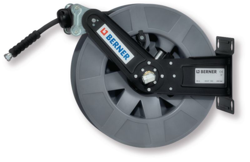 Enrouleur mural ouvert haute-pression 18 mètres Ø tuyau 3/8' avec raccords ebtrée et sortie filetage 3/8 femelle. (par 1)