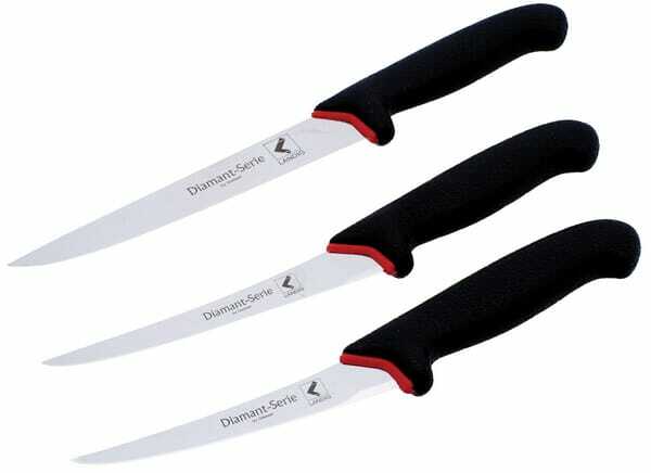 Extra info : Couteaux professionnels à manche super adhérent pour couper la viande Le kit de compose de : - Couteau à désosser semi-flexible 13 cm - Couteau à désosser semi-flexible 15 cm - Couteau à steak 16 cm