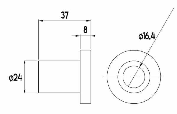 Diamètre intérieur : 16,4 mm Diamètre extérieur : 24 mm Diamètre extérieur de la bride : 40 mm Longueur : 37 mm Épaisseur de la bride : 8 mm Matériau : Acier