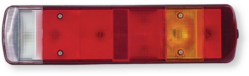 Feu arrière gauche avec feu d'encombrement latéral multifonctions type Volvo/Scania clignotant BA15S 21W, Stop BA15S 21W, recul BA15S 21W, brouillard BA15S 21W, position BA15S 10x2W, feu d'encombrement BA15S 10W, éclaireur de plaque BA15S 10W homologué transport de matières dangereuses (par 1)