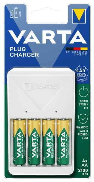 Chargeur de prise VARTA avec des caractéristiques de sécurité complètes : Coupure delta V, minuterie de sécurité, protection contre les courts-circuits, détection des piles alcalines et mauvaises, protection contre la mauvaise polarité.