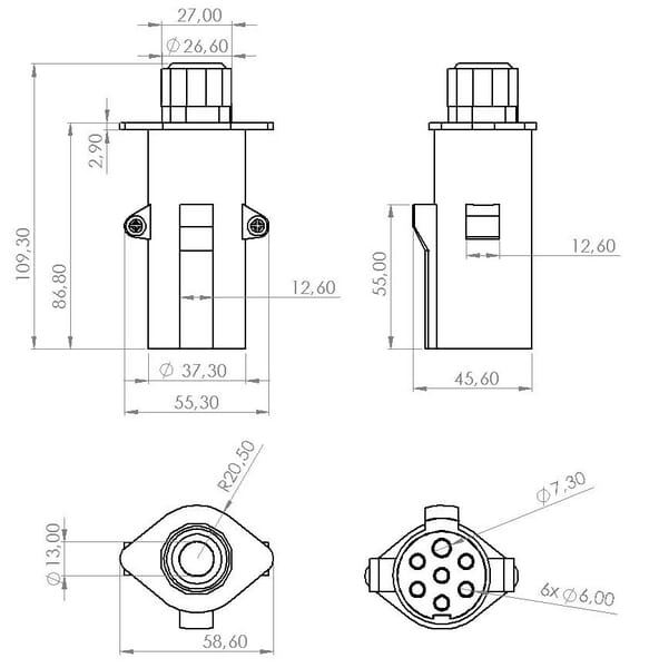 Fiche de remorque 7 broches, aluminium, 24V, bornes à vis
