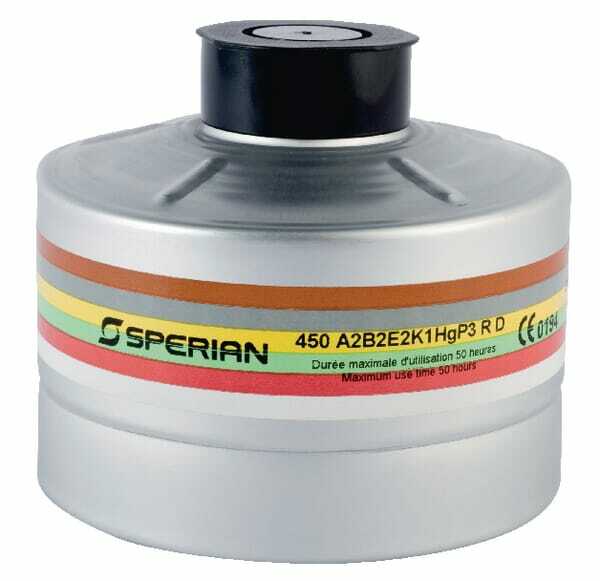 Domaine d'application : Composition des désignations de filtre : AX = vapeurs des composés organiques, point d'ébullition <,&,#160, >, 65 °C (point d'ébullition bas) A = vapeurs des composés organiques, point d'ébullition >, 65 °C B = gaz et vapeurs inorganiques comme le chlore et l'hydrogène sulfuré E = dioxyde de soufre K = ammoniac P1 = particules (fumée, poussière) des substances inertes P2 = particules des substances nocives P3 = particules des substances toxiques Hg = vapeurs de mercure