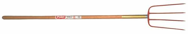 Informations techniques : Fourche à fumier avec manche boule en frêne, légèrement courbé ·Aérer et déplacer le tas de fumier ·Avec manche férule ·Dents laquées en rouge, forgées et trempées