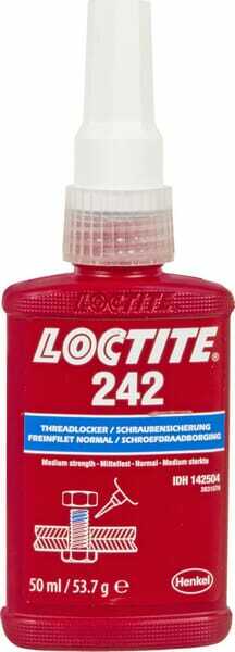 LOCTITE 242 est un frein-filet universel à base d'acrylate de méthyle de force et de viscosité moyennes pour les filetages métalliques. Il a un temps de fixation rapide et le liquide reste en place et ne fuit pas après l'application. Ce composé de blocage peut être utilisé sur l'acier, le laiton et l'acier inoxydable et les connexions peuvent être démontées avec des outils manuels standard.