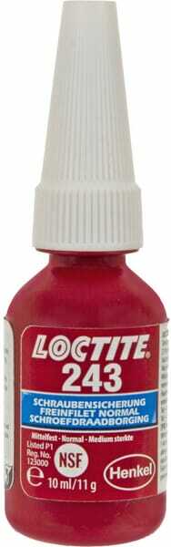 LOCTITE 243 est un frein-filet d'usage général, de force moyenne, pour fixer et sceller les boulons et les écrous. Il convient à tous les métaux, y compris les métaux passifs comme l'acier inoxydable, l'aluminium et les matériaux ayant subi un traitement de surface. Il tolère une légère contamination par les huiles industrielles, telles que les huiles moteur, les huiles anticorrosion et les fluides de coupe. Les connexions peuvent être démontées à l'aide d'outils manuels standard.