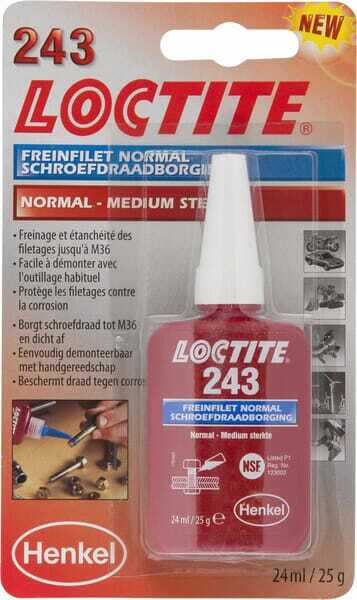 LOCTITE 243 est un frein-filet d'usage général, de force moyenne, pour fixer et sceller les boulons et les écrous. Il convient à tous les métaux, y compris les métaux passifs comme l'acier inoxydable, l'aluminium et les matériaux ayant subi un traitement de surface. Il tolère une légère contamination par les huiles industrielles, telles que les huiles moteur, les huiles anticorrosion et les fluides de coupe. Les connexions peuvent être démontées à l'aide d'outils manuels standard.