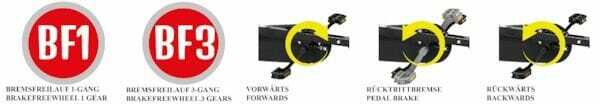 Informations techniques : - Freinage roue libre avec changement de vitesse 3 voies pour déplacement en avant et en arrière sans commutation supplémentaire, frein de marche arrière intégré pour un arrêt confortable et sécurisé