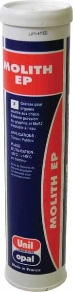 Particularités : - MOLITH EP est particulièrement adaptée aux organes soumis aux vibrations et aux chocs : bras télescopiques, paliers lisses, rotules, articulations, cames, galets … - Trouvera naturellement son utilisation sur du matériel de génie civil ou de carrière. - Caractéristiques de friction exceptionnelles grâce au bisulfure de molybdène et au graphite - Très grande résistance aux chocs et aux fortes charges - Résistance élevée à la corrosion - Niveau extrême pression (EP) - Graisse au lithium - Texture Lisse - Couleur : noire - Grade NLGI : 2 - Plage de température -20 / +130°C - Vitesse : faible à moyenne