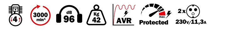 Il est équipé de deux prises de courant 230 Volt pour une alimentation électrique facile, dispose d'un grand réservoir à essence de 15 litres avec indicateur du niveau de remplissage pour une utilisation en continu.