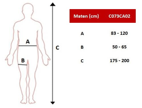 Extra info : Taille : 2 Hanche : 83-120 cm Tours de cuisse : 50-65 cm Taille du corps : 175-200 cm