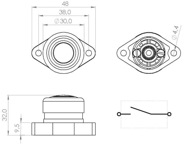 Interrupteur à bouton-poussoir, 12V, 6A, on-off (mom), bornes à vis