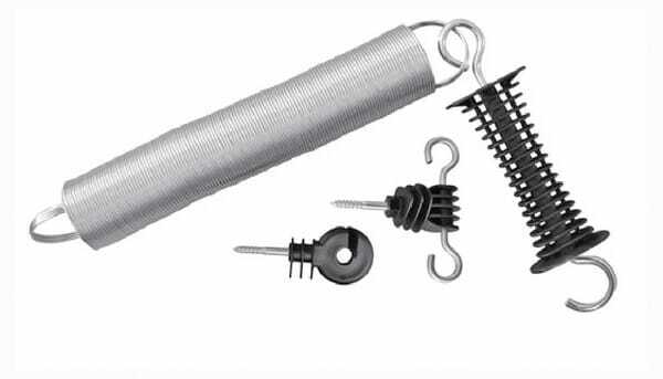 Informations techniques : étirable jusqu’à 5 m Se compose de : 1 x poignée avec crochet, 1 x ressort spécial étirable, 2 x isolateurs (ne convient pas pour enclos à chevaux).