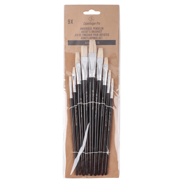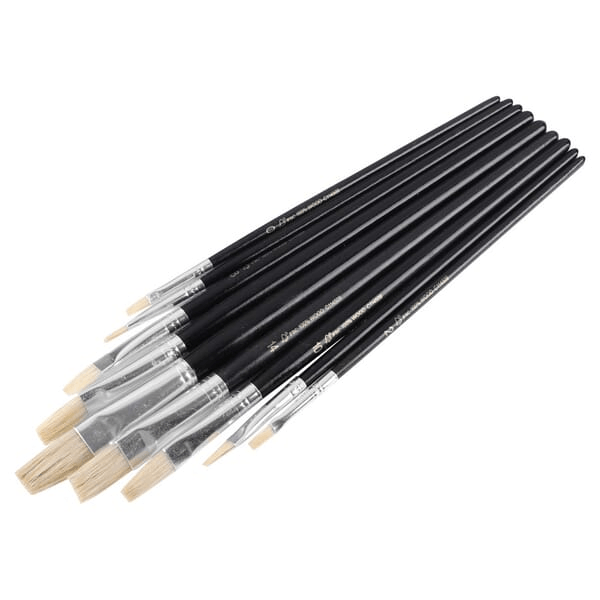 Jeu de pinceaux universels plats de 9 pièces, en poils de porc chinois blanc, avec virole en aluminium et manche en bois laqué noir. Ces pinceaux à peinture liner conviennent à tous les types de peinture.