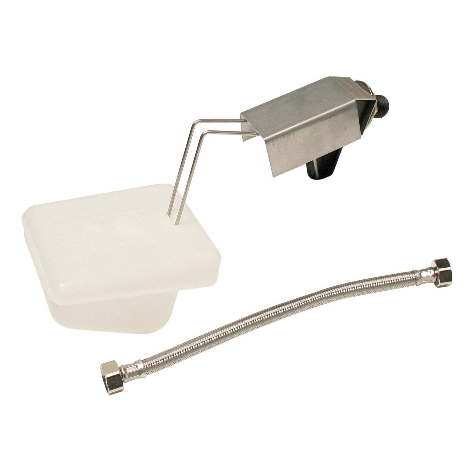 Kit comprenant une robinetterie synthétique à flotteur et déflecteur inox et une tresse inox 1/2”.