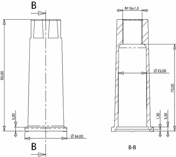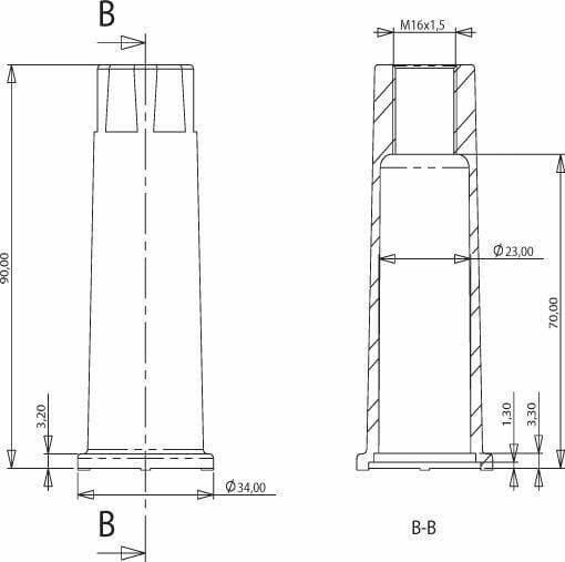 Diamètre de filetage : M16 Pas de vis : 1.50 mm Distance entre les trous centraux : 45 mm Diamètre extérieur du collier : 34 mm Longueur totale : 90 mm