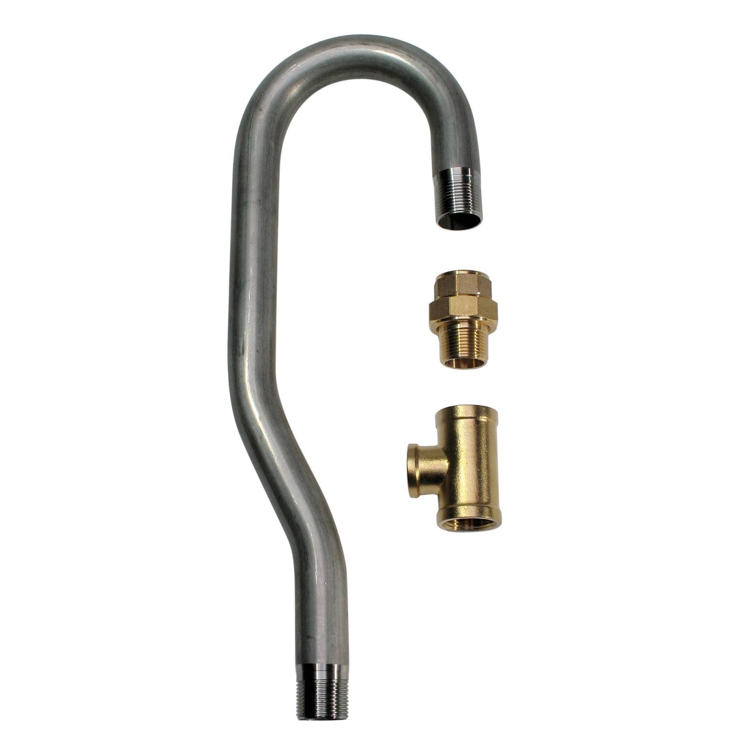 Avec un tube inox fileté mâle-mâle 3/4”, un raccord T et un raccord tournant en laiton pour faciliter le montage.