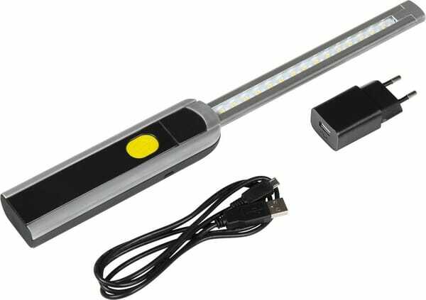 Type : Inspection Lamp Se compose de : - Lampe - Chargeur 230V - USB câble - Crochet - Aimant en bas - Indicateur de batterie - Interrupteur marche / arrêt Temps de fonctionnement sur batteries : 7 h Particularités : - Lampe d'inspection très mince pour éclairer des espaces difficiles à accéder - Lampe est pliable, peut être utilisée dans plusieurs positions - Interrupteur marche / arrêt - 2 modes d'éclairage - Indicateur de batterie Domaine d'application : - Usage professionnel Caractéristiques : - Boîtier en aluminium - 15 SMD-LEDs avec 2 modes d'éclairage (100%, 600 Lm et 50%, 300 Lm) - Durée de fonctionnement: ± 4 heures à 100% et 8 heures à 50% - Protection contre la surcharge et le déchargement (max. 24h) - Crochet et interrupteur marche / arrêt - Rechargeable 230V, USB Informations techniques : - Homologations CE, GS and RoHS - Garantie de 12 mois sur les erreurs de fabrication - Même en cas de non-utilisation, l’accu doit être rechargé régulièrement (tous les 3 mois environ) Avantages : - Pliable 150° - Design plat 7mm - Indicateur de batterie - Aimant fort en bas - Sans fil, rechargeable - Faible consommation