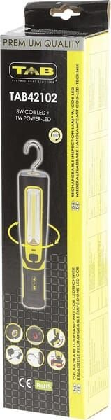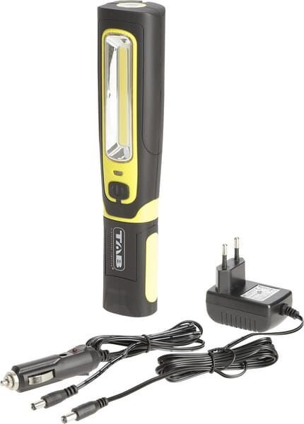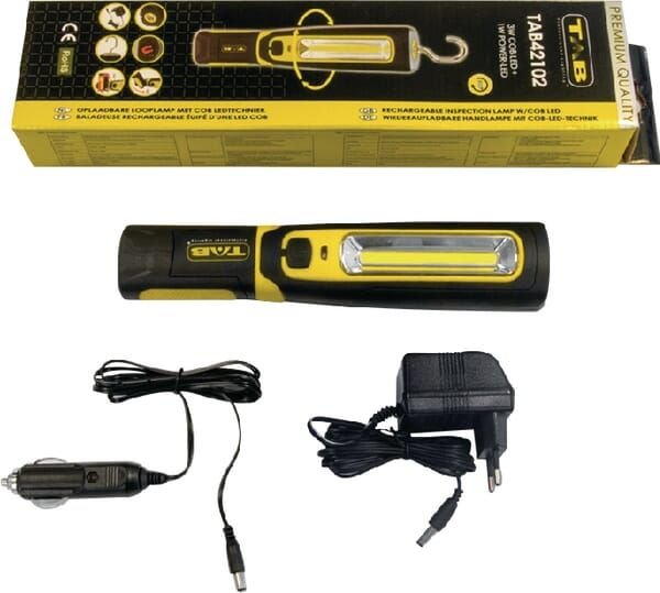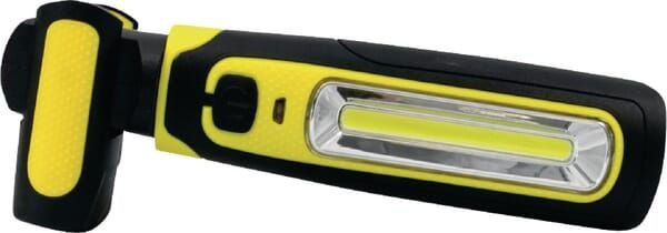 Détails du produit : - Lampe d'inspection rechargeable avec LED COB 6 W (300-600 LM) et lampe torche Power-LED 3 W (160 LM) dans la tête - Lampe utilisable dans différentes positions (lampe rotative à 360°, base pivotante 2 x 90°) et mains libres grâce aux aimants et au crochet de suspension rotatif à 360° - Boîtier ABS résistant aux chocs, recouvert de caoutchouc et crochet de suspension en acier - Equipé d'un indicateur de batterie