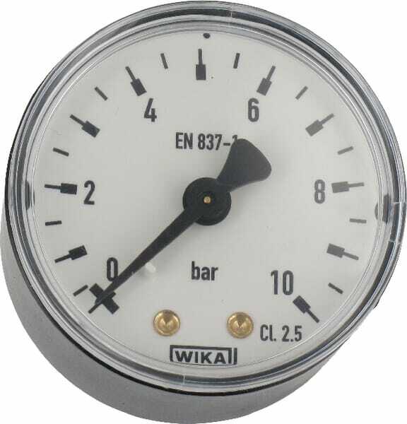 Type de montage : Raccord arrière Indication du type : Analogique Pression min. : 0 bar Pression max. : 10 bar Diamètre extérieur du boîtier : 50 mm Type de filetage du raccord : BSP Diamètre de filetage du raccord : 1/4 Inch Matériau du boîtier : Plastique Matériau du raccord : Laiton Rempli : Non Rempli de : n/a Température de service min. : -20 °C Température de service maximale : 60 °C Diamètre extérieur : 50 mm