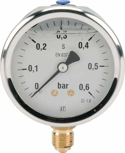 Catégorie de produits : Manomètre Type de montage : Raccord inférieur Indication du type : Analogique Pression min. : 0 bar Pression max. : 0,6 bar Diamètre extérieur du boîtier : 63 mm Type de filetage du raccord : BSP Diamètre de filetage du raccord : 1/4 Inch Matériau du boîtier : Acier inoxydable Classe : 1.6 Rempli : Oui Rempli de : Glycérine Température de service min. : 5 °C Température de service maximale : 60 °C Matériau du verre : Plastique Série : 7211