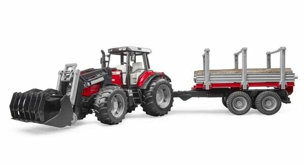 Détails du produit : - Masse avant amovible - Capot moteur ouvrable - Option benne - Crochet de remorquage à l’arrière du tracteur - Les deux véhicules sont équipés de pneus à profil - Cet ensemble comprend un tracteur avec remorque et trois troncs - Bruder série Profi