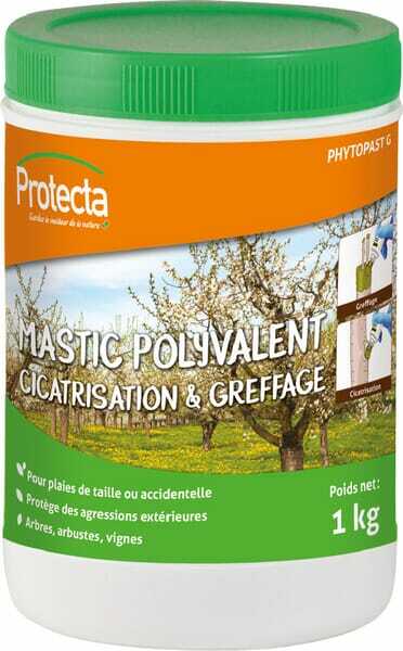 Informations techniques : Appliqué sur des surfaces saines, cette « barrière » protège et facilite la cicatrisation des plaies contre les agressions diverses. Grâce aux propriétés physiques de l’enduit, le bourrelet cicatriciel se forme plus rapidement. Le mastic polyvalent PROTECTA est composé d’une émulsion de résines de synthèse et d’huiles végétales. Il reste souple et ne craquelle pas. L’application du mastic polyvalent PROTECTA doit se faire immédiatement après la taille ou le curetage. Après chaque utilisation, prenez soin de laver les poils de la brosse à l’eau et de bien refermer le bouchon. Ne pas utiliser le mastic polyvalent PROTECTA par temps pluvieux. Une période de séchage de 4 à 8 heures est nécessaire pour éviter tout lessivage par la pluie.