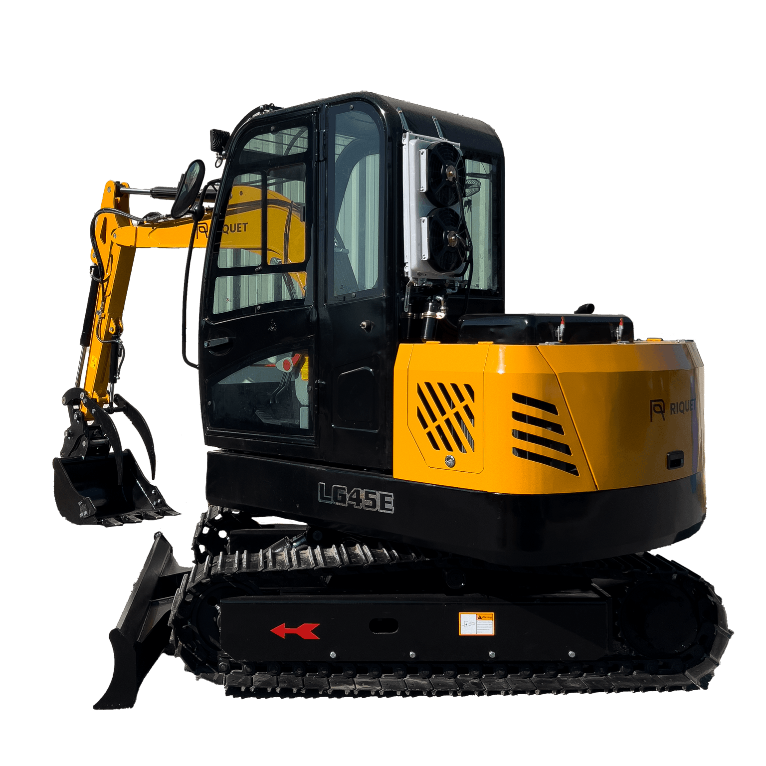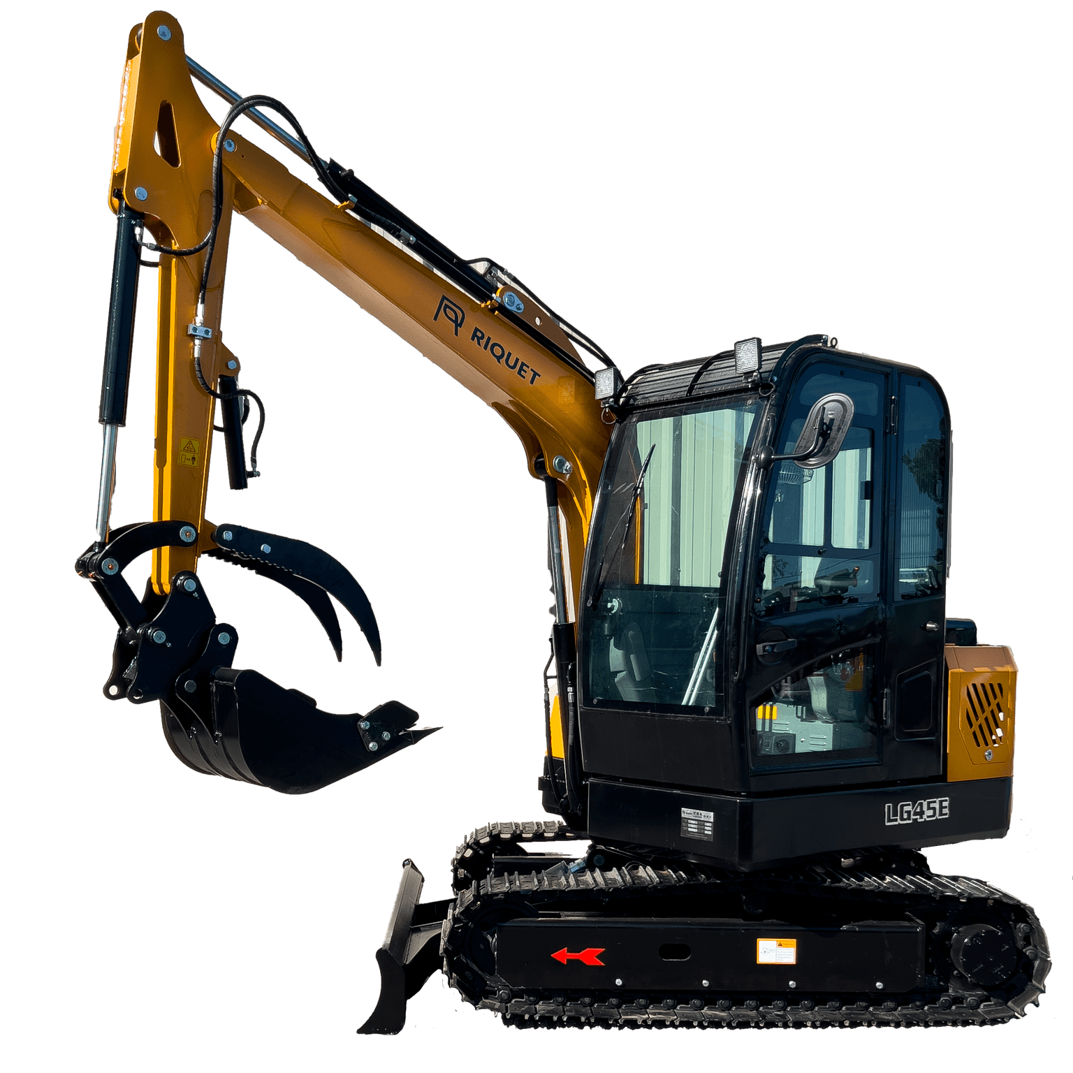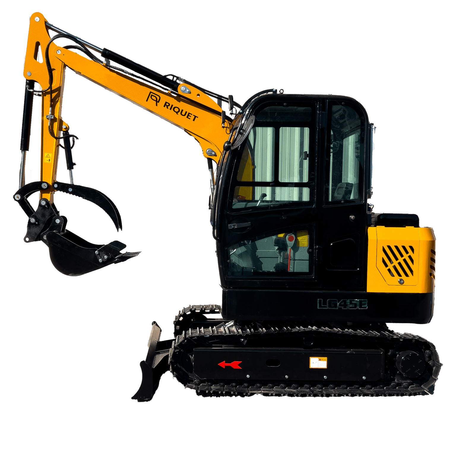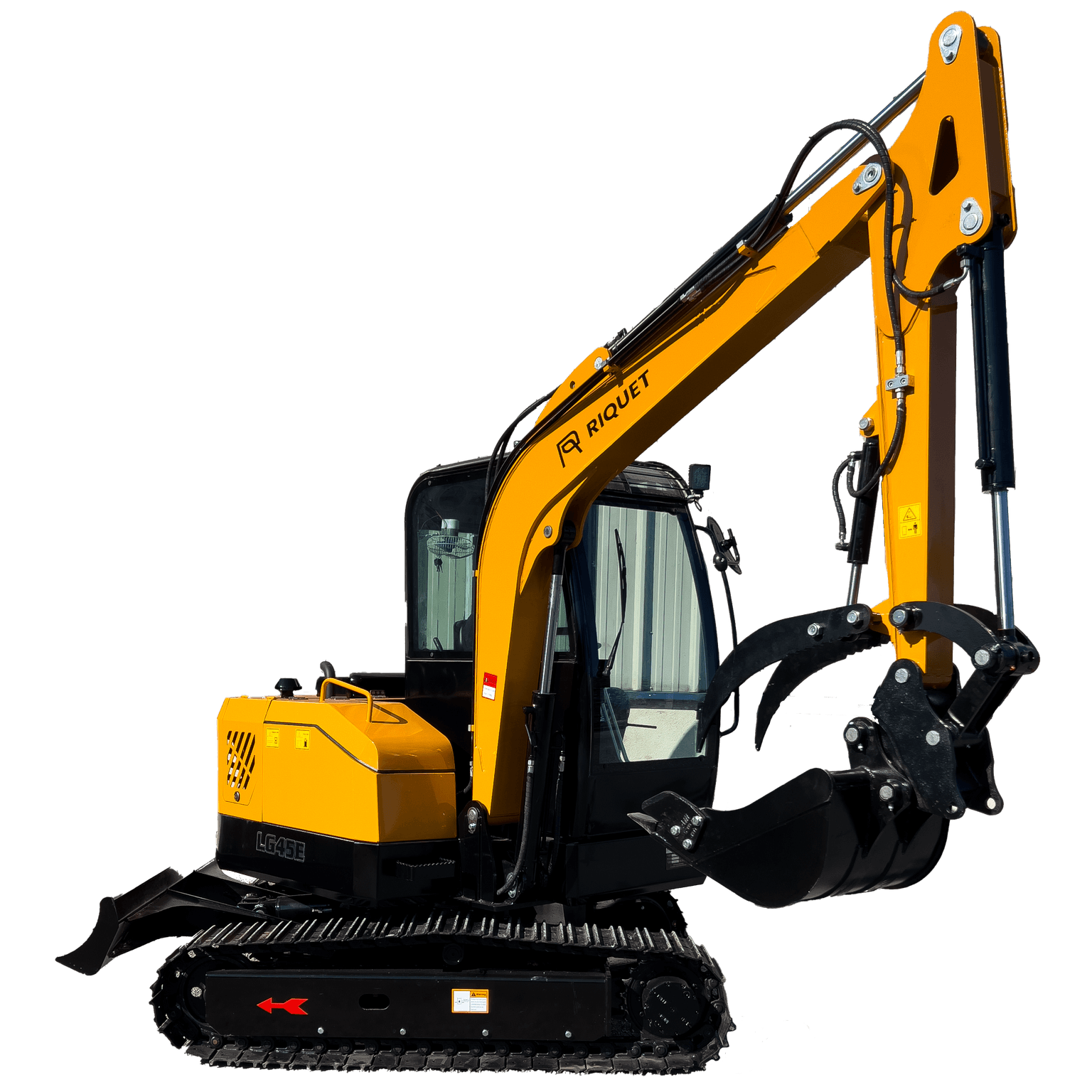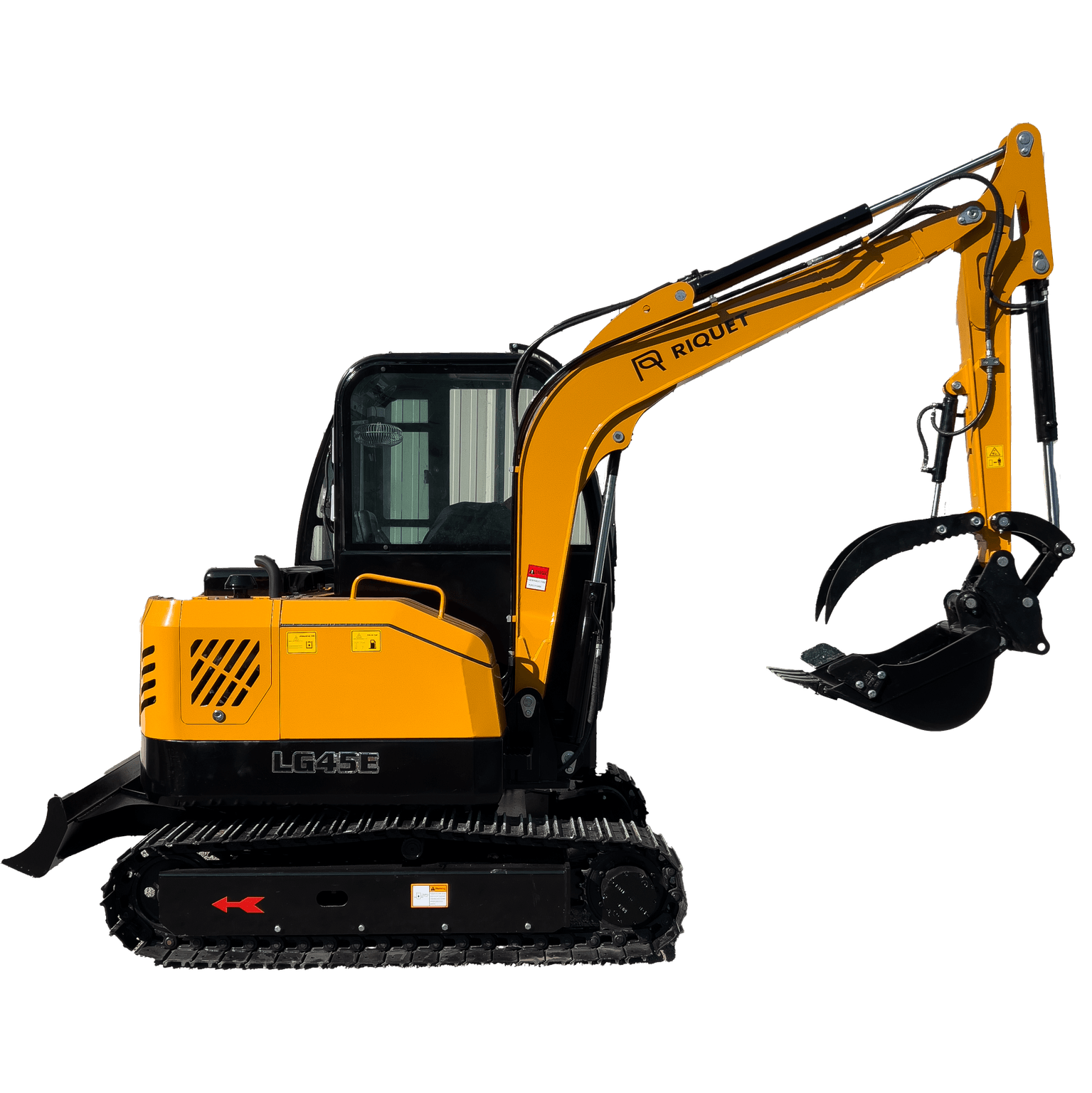 Minipelle Riquet LGR45 Poids opérationnel 3500kg Moteur Diesel Kubota 3 cylindres D1703 25cv Avec godet 30/50/120cm à attelage rapide Avec pouce hydraulique de série Lame de nivellement Cabine climatisée Chenilles metalliques avec blocs PVC amovibles Commandes par monoleviers Pivotement du bras hydraulique Pression hydraulique 220 bars Hauteur 245cm / Largeur 170cm / Longueur 440cm Longueur du train roulant 220cm Profondeur de fouille 305cm Hauteur de fouille max 468cm Hauteur de déchargement max 326cm Longueur de fouille max 310cm Dégagement sous lame bull relevée 27cm Profondeur de travail lame bull maxi 38cm